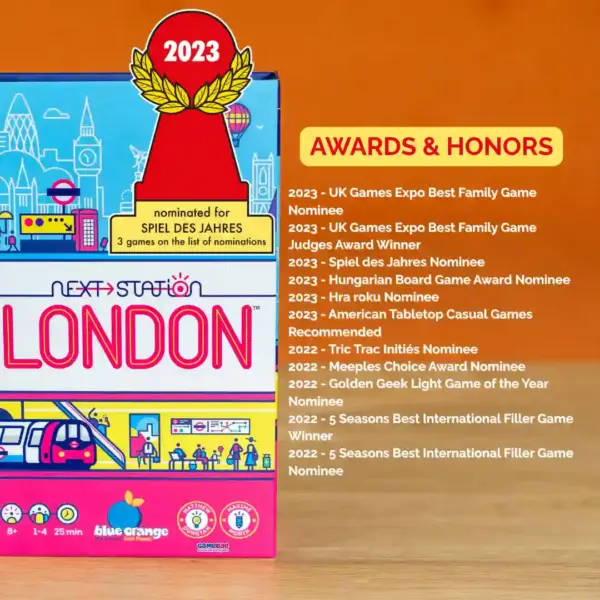 Next Station: London was a Spiel des Jahres 2023 Nominee, a testament to its creativity, accessibility, and replay value. Designed by Dave Campbell with vibrant illustrations from Simon Douchy, it’s a visual and strategic delight that appeals to players of all ages.