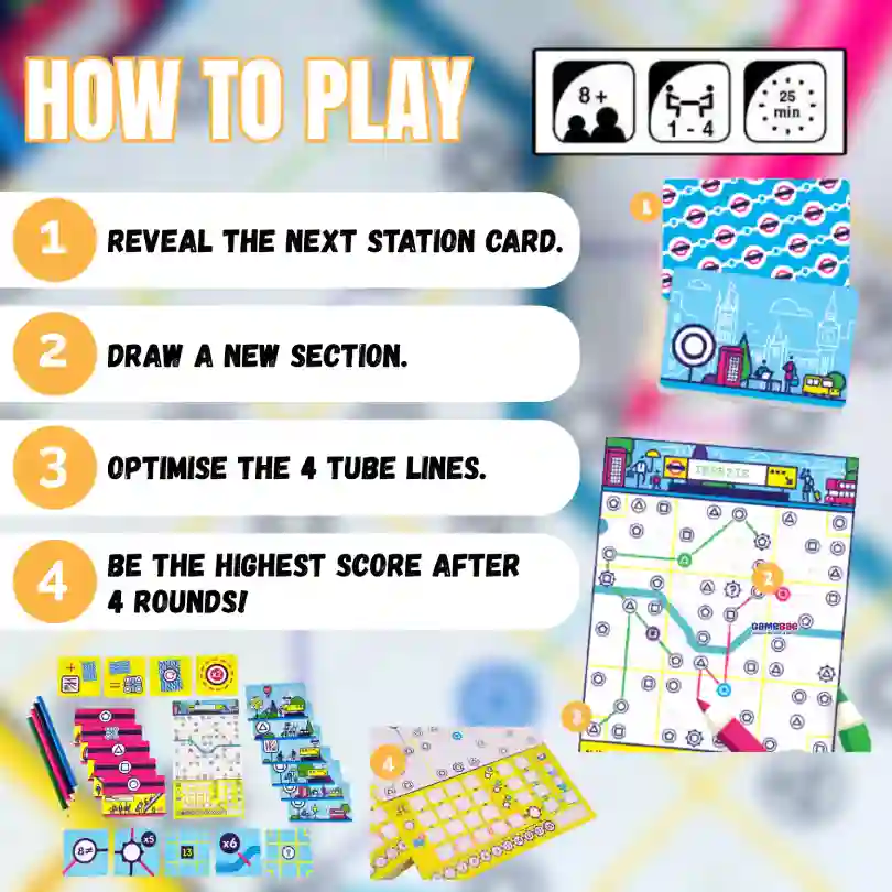 - Color-coded rounds: In each of the four rounds, players use a different colored pencil, constructing four unique subway lines.