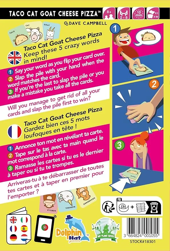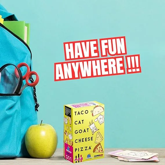 Whether you’re looking for a quick after-dinner game, something to entertain kids during a rainy afternoon, or a unique party game that gets everyone involved, Taco Cat Goat Cheese Pizza is a must-have addition to your game collection.